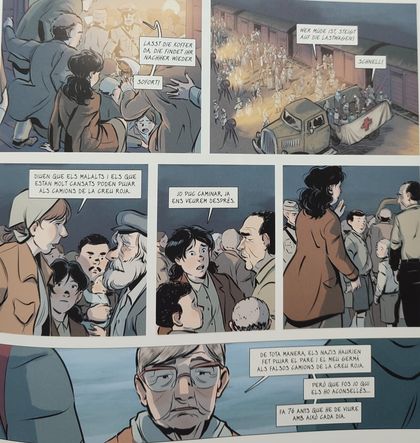 Tot i l’horror del camp, la història és descrita de forma força un tant asèptica, sense excés d’escenes escabroses. De fet, aquí el dibuix de Cesc i Efa acompanyen a aquesta visió més suau o respectuosa amb les persones que hi apareixen. Sota unes vinyetes enormes hi descobrim gran detallisme en l’ambientació i una caracterització de les persones amb formes arrodonides, rostres amables. De fet, tot el còmic té quelcom de lluminós, no sé si pels colors triats o per l’estil amb que s’ha il·lustrat.